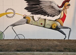 E' una figura ibrida ispirata al mondo mitologico che incarna un nuovo mezzo di trasporto con le sembianze di un cavallo (uno dei primi mezzi di trasporto), prodotto dal riuso e riciclo di scarti meccanici e automobilistici che fuoriescono metaforicamente dal logo della stessa azienda presente sulla parete su cui é stata realizzata l'opera murale.